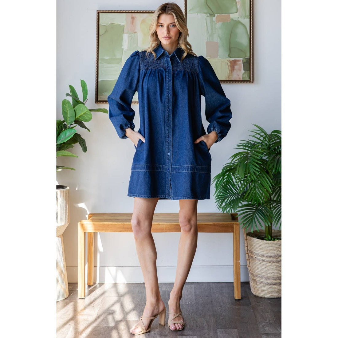 Smocked Shoulder Puff Sleeve Denim Shirt Dress
