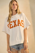 Boxy short-sleeve sweatshirt with bold 'TEXAS' varsity print and ribbed trims.