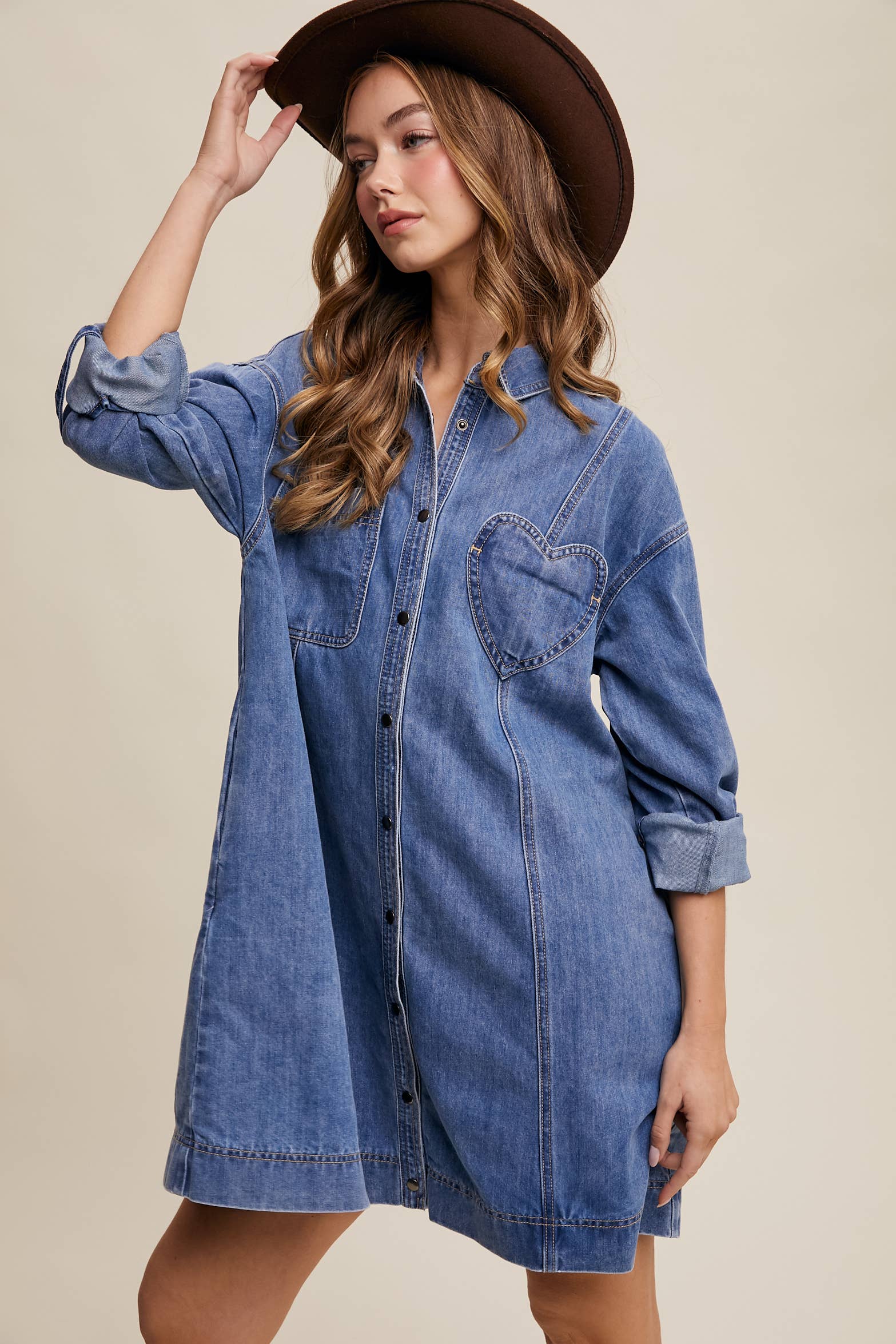 💙Our Denim Heart-Pocket Shirt Dress 💙blends effortless denim style with a playful heart detail that makes it truly special. Designed with a relaxed fit and soft, lightweight denim, this piece is perfect for layering or wearing on its own all year round.