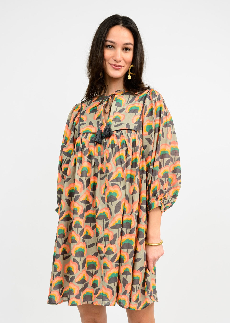 Featuring a square yoke detail, tassel ties, and billowy 3/4 sleeves, this dress is easy to wear and perfect for styling with boots, sneakers, or sandals. Lightweight and breezy, it transitions beautifully between seasons.