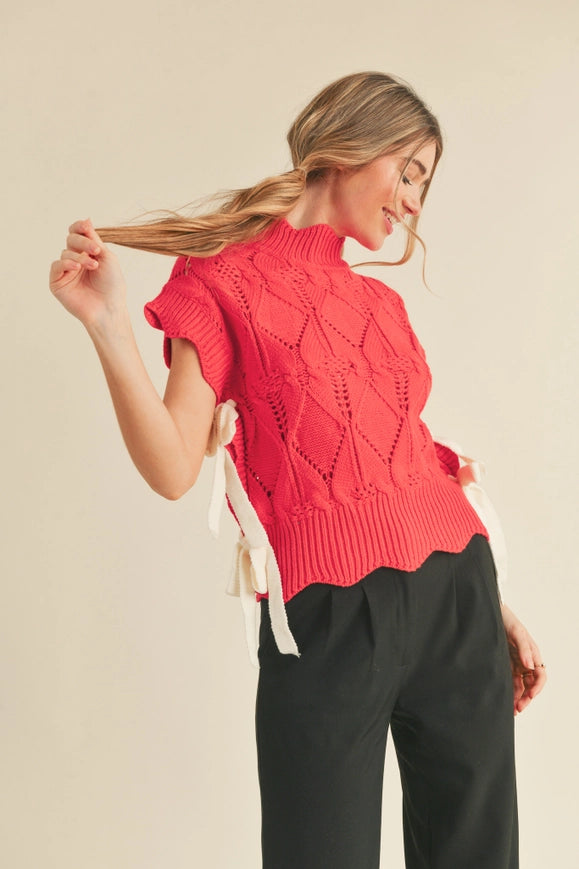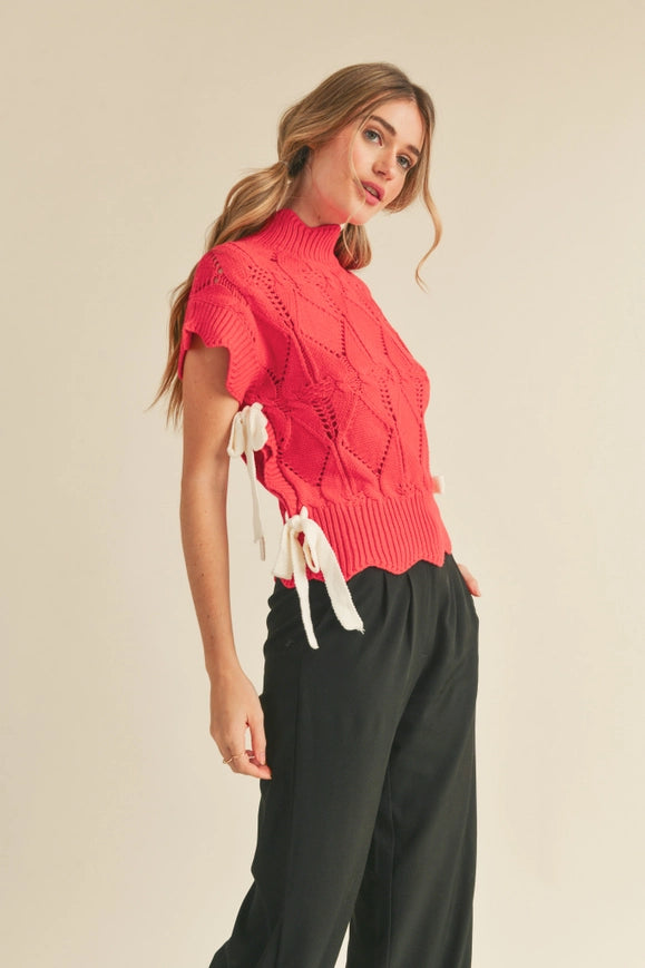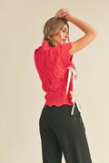 Scalloped Mock Neck Cropped Sweater Vest with Side Ties