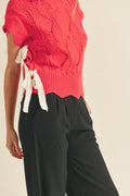 Embrace the changing seasons in style with this chic mock neck cropped sweater vest! Crafted from a soft knit, this sweater features a ribbed, scalloped mock neck and scalloped edges at the hem and shoulders for a feminine touch. The cropped bodice is perfect for layering over your favorite tops or dresses, while the contrast knit side ties add a playful, trendy detail. Finished with a delicate pointelle design, this sweater vest brings texture and charm to your wardrobe, making it the perfect transitional piece for any season.