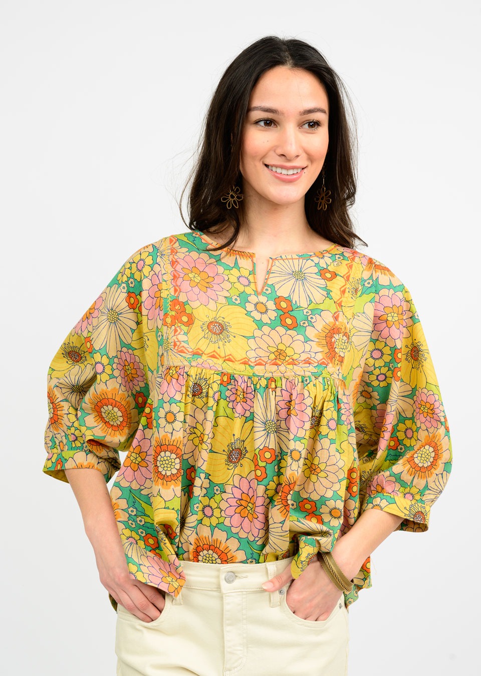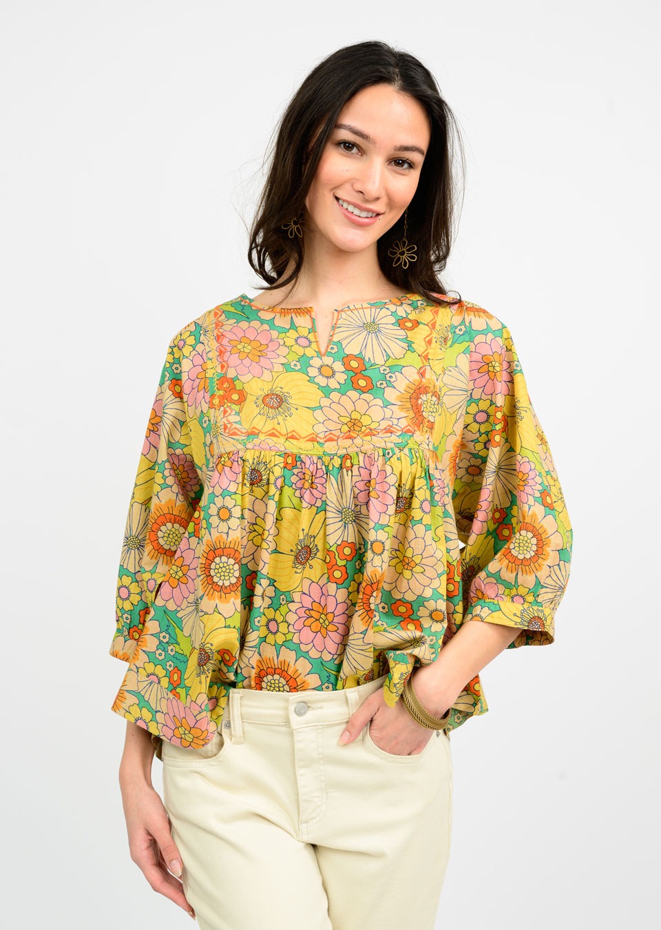 Bright, happy, and full of retro charm — the Sunshine Bloom Peasant Top by Ivy Jane is a standout piece for color lovers. Covered in bold floral prints in shades of yellow, coral, pink, and green, this top brings that vintage-inspired boho vibe Ivy Jane does so well.